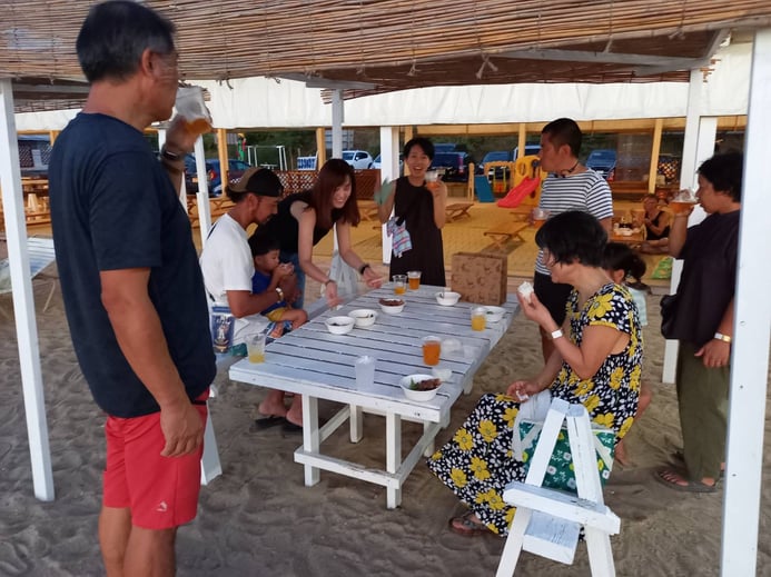 お盆も終わってほっと一息。ケヤンズにも沢山のお客様に来て頂きました!ありがとうございました。今日は、海の家「磯の屋」さん主催の夕暮れのビーチパティ―です。すっかり顔見知りになった方たちと楽しいおしゃべり。夜の7時からスタートしましたが、まだまだ辺りは明るいです。食べ放題、飲み放題で皆の舌も滑らかになって、さらにおしゃべりが弾みます。陽気な音楽もかかって踊る人、ビーチを走る子供たち、気が付くとっぷりと日が暮れて、すっかり夜です。ほんとに幸せな時間が流れました~♪皆、千鳥足で家路につきました。