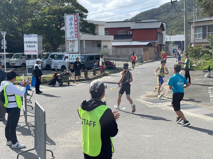今日は芥屋海水浴場で、今年で2回目となった「糸島アクアスロン大会」が行われました。大人から子供まで総勢約250名程度が参加しての大会です。やっと暑さも落ち着いて過ごしやすくなったのですが、今日はお天気は良いものの、あいにく風が強く、海水浴場の波も高いので、スイムの種目は中止になり、代わってビーチでのランになりましたが、みなさん、元気に走りました!芥屋観光振興会では、ドリンクサービス付きの案内チラシを配布、観光振興会役員のホストも配布してきましたよ~。
